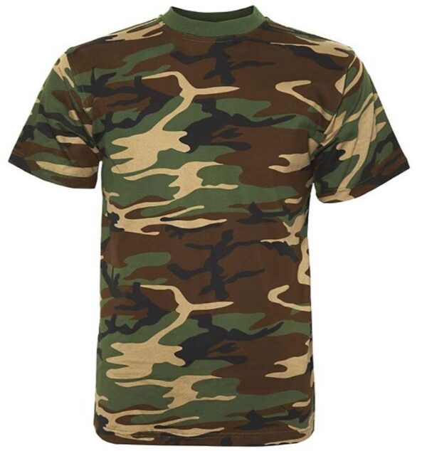 Camo T-shirt met korte mouw en ronde hals. Uitstekende kwaliteit. Woodland camo – 100% Katoen – 160 gram/m2 – Gewicht: 176g