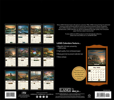 Amerikaanse Lang kalender. LANG-wandkalenders hebben maandelijkse full colour afbeeldingen, elegant linnen reliëfpapier en een koperen oogje om op te hangen.