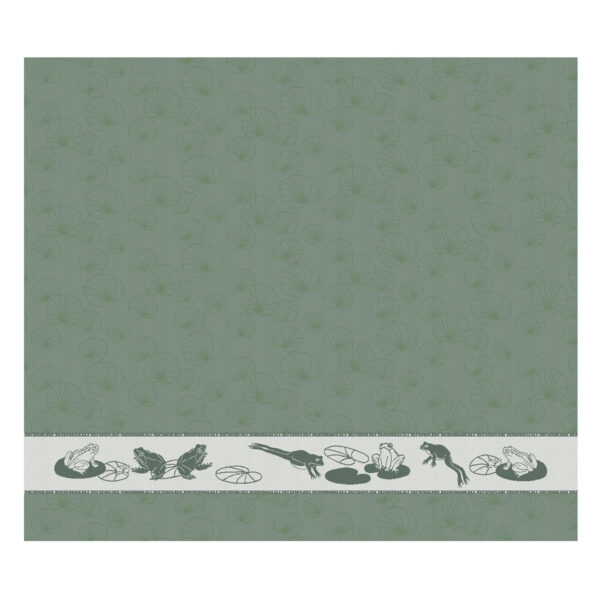Theedoek Froggy van DDDDD staat helemaal in het teken van de natuur. Het heeft een dessin van waterlelie bladeren die lijken rond te drijven en in de witte border springen vrolijke kikkers in het rond. Uitgevoerd in een mooie bijpassende kleur laurel groen.