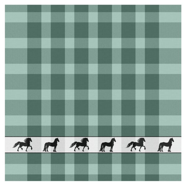 Het ontwerp is uitgevoerd in een groene kleur en in de border staan trotse Friese paarden afgebeeld in contrastrijk zwart.