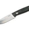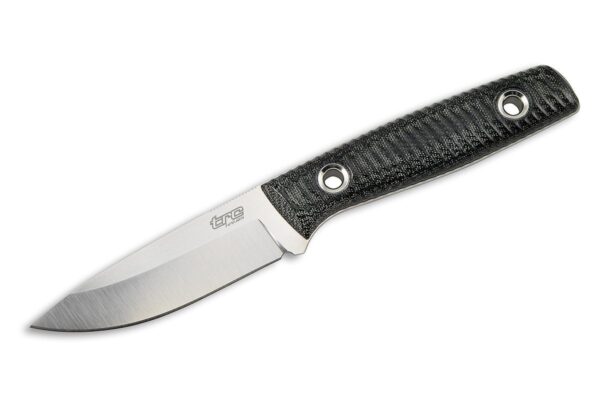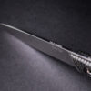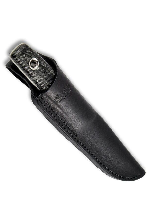 The knife has classic sharp drop-point style blade made of M390 steel and ergonomically perfect grip handle made of structured and polished Black Canvas Micarta scales. This is a full tang knife.