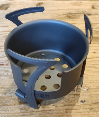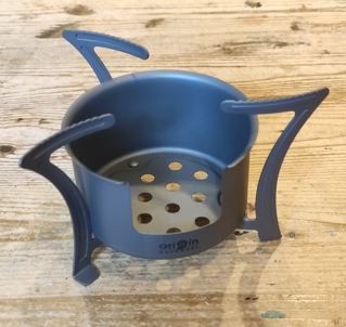 Titanium houtbrandertje. Tevens beoeld als standaard voor een spiritusbrander. Uitklapbare pannensteunen.