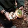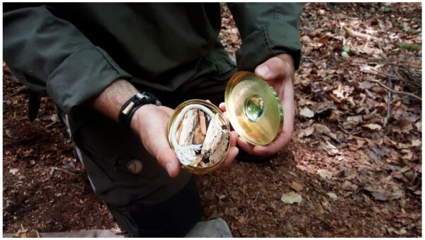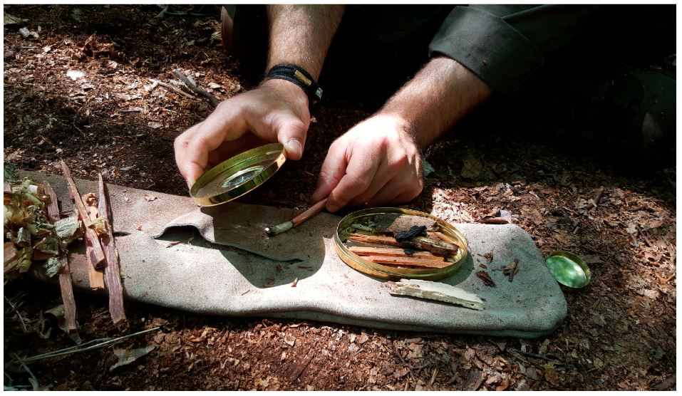 Koperen tondeldoos. De tondeldoos heeft een brandglas verwerkt in het deksel, en is volkomen identiek aan een model dat 250 jaar geleden veelvuldig werd gebruikt door ontdekkingsreizigers, mountain men en andere buitenmensen als tabaksdoos. Met het vergrootglas (vergroting 6X) werd de tabak in de pijp aangestoken. Ideale doos voor het bergen van char cloth en ander ontstekingsmateriaal.