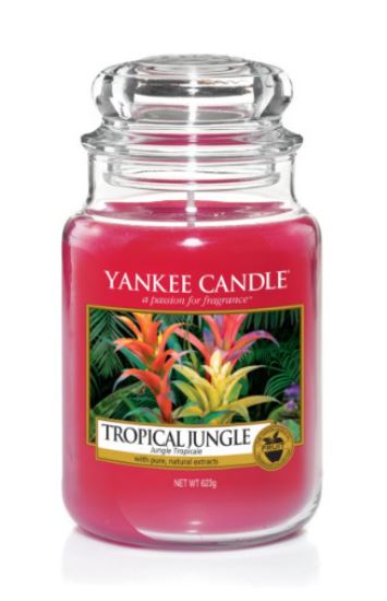 Yankee Candle Tropical Jungle geurkaars in grote glazen pot. Een zoete, weelderige mix van tropische geuren – exotisch fruit, vallende bloemen en groen jungleblad.