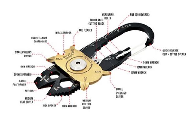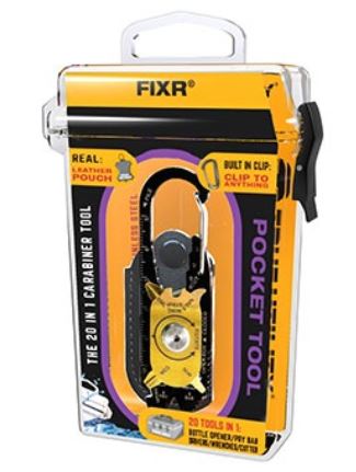 De FIXR is gemaakt van roestvast staal gecoat titanium en kan aan een sleutelbos worden gehangen. Deze tool heeft in totaal twintig verschillende functies met o.a. schroevendraaiers, moersleutels, spakenspanner, flesopener, kabelstripper, liniaal en een nagelvijl. Wordt geleverd met een lederen etui en in de bekende waterdichte transparante kunststof bewaarbox.