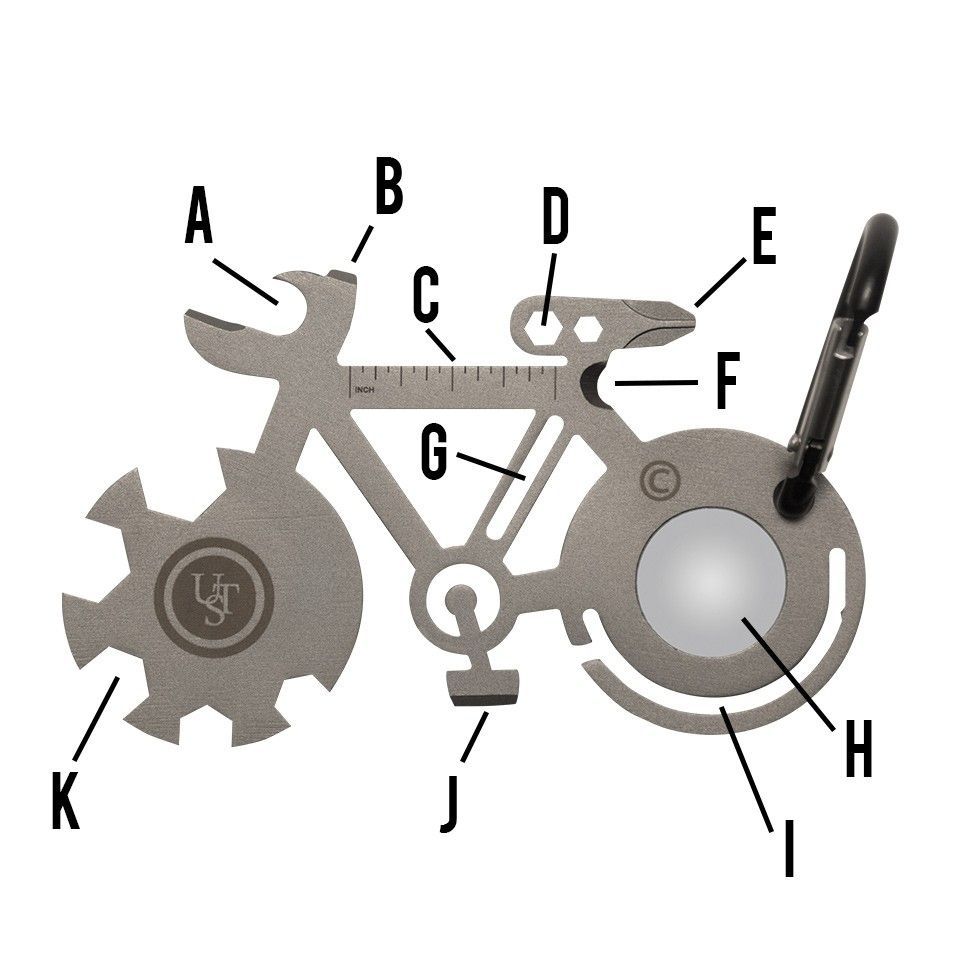 De UST Bicycle tool s een multitool in zakformaat waarmee je verschillende taken onderweg kunt uitvoeren. Klem hem aan je zadeltas met de meegeleverde karabijnhaak.