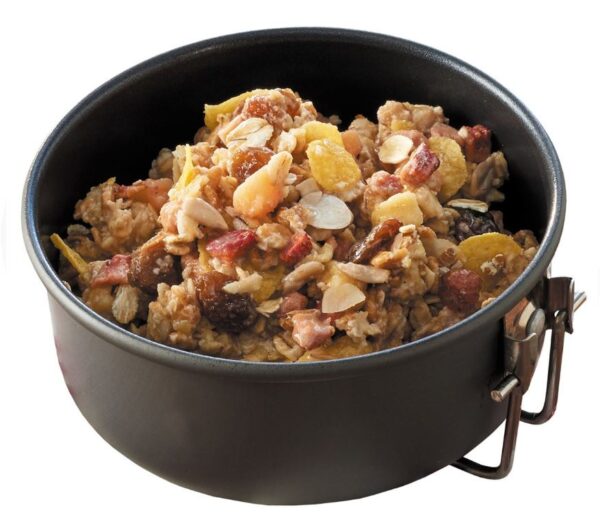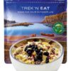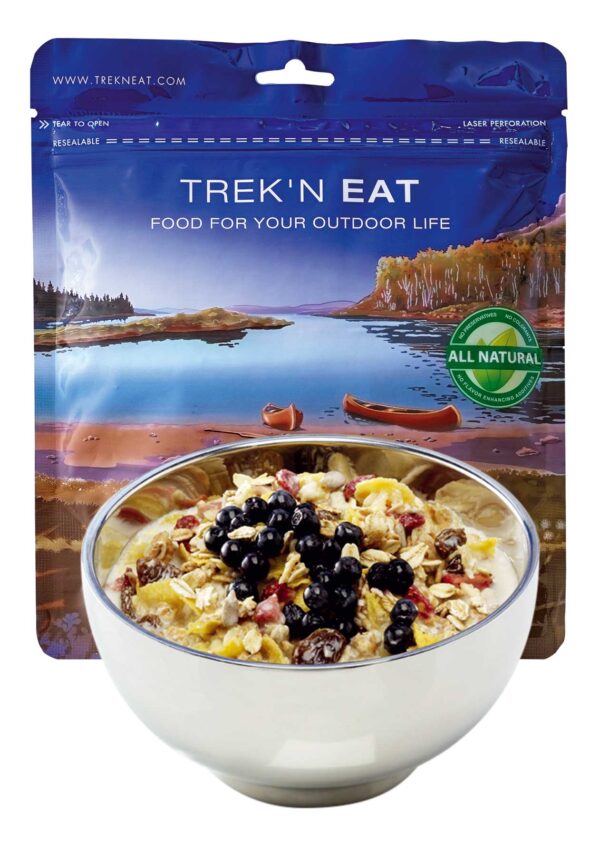 Trek ‘ Eat volkoren muesli met melk en bessen. Een prima begin van de dag! Droogelementje verwijderen, water toevoegen (210ml), even laten intrekken, en smullen maar. Kan zo uit het pak gegeten worden.