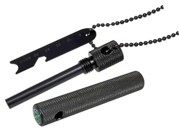 Met een magnesium vuurstaal, zoals deze FireStarter, heb je in noodgevallen in ieder geval 1 zorg minder. Met de metalen strip kun je spaanders van hout schrapen. Het is tevens voorzien van kleine lineaal en een afstandtabel in 1:10.000 en je kunt er moertjes mee aandraaien. Het stevige aluminium huis van het vuurstaal sluit met een schroefsluiting en heeft een ingebouwd kompasje. Lengte 12cm.