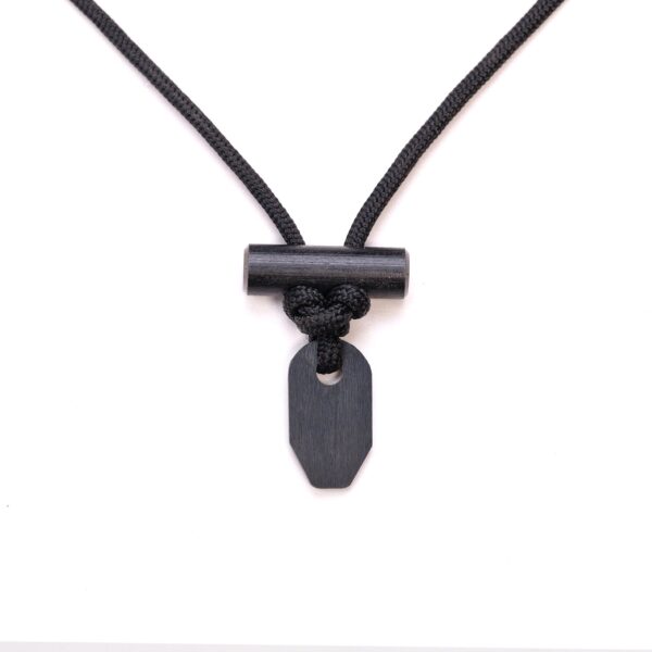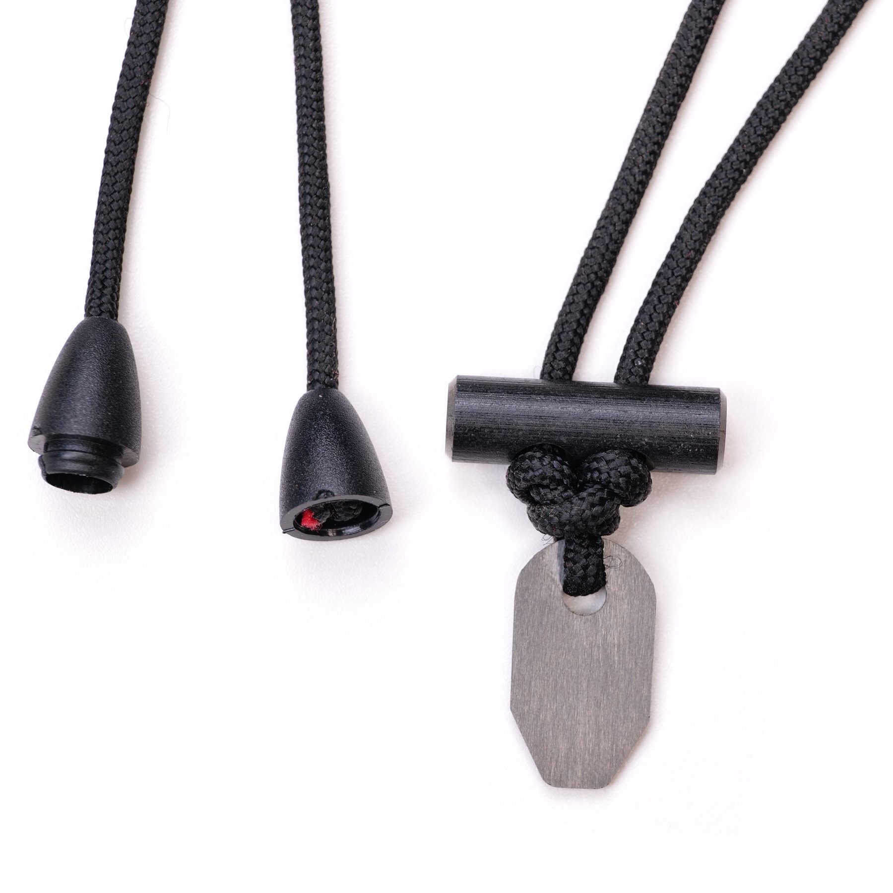 Vuurstart halskoord, schraper, vuurstaal, ontstekingsmateriaal en vuurkoord in één.