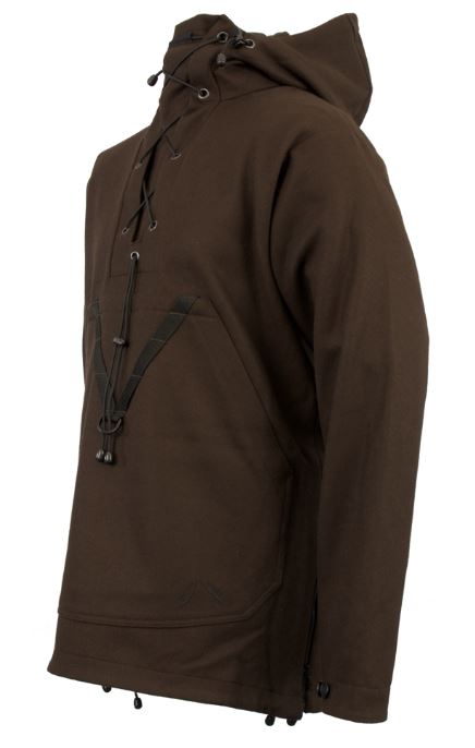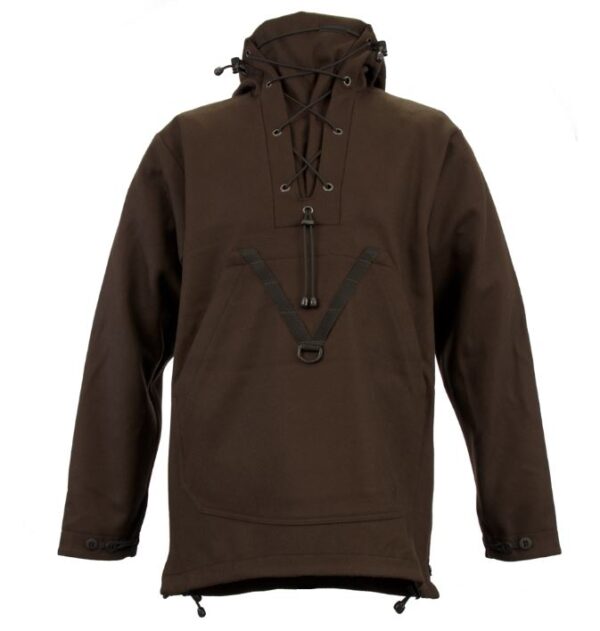 Roughstuff Haudegen, wollen bushcraft anorak. Deze anorak is de effectieve buitenste laag van het meerlagen kleding systeem. Bij koel weer draag je er misschien een dunnen pullover onder, bij erg koud weer een dikke trui, enz.