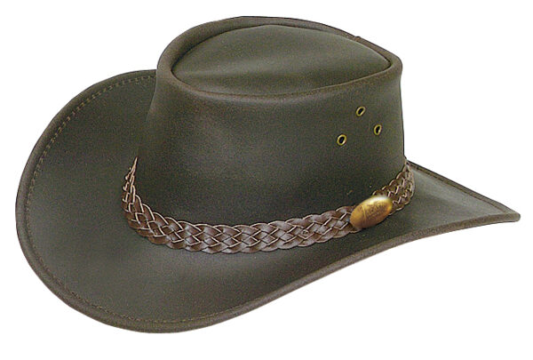 Cow Hide – Oiled Leather; 5 Strand Hatband and Brass Jacaru Badge; 6 Eyelets for Ventilation; Water Resistant, UV Protective Properties, Durable Leather.