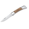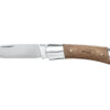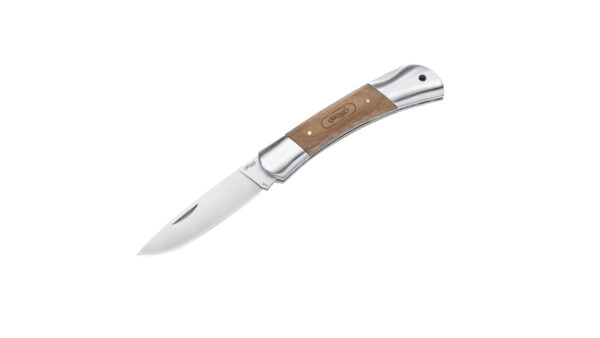 De greep, met notenhouten schalen en een roestvrijstalen bolster, geeft dit mes een klassieke uitstraling en een backlock beveiligt het lemmet.