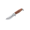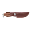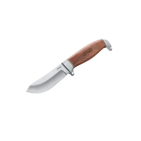 Het elegant gevormde walnoothouten handvat heeft een roestvrijstalen pommel en bolster (met mooie messing en fiber liners) die voorkomen dat het mes in beide richtingen uit uw hand glijdt. De compacte Premium Skinner wordt geleverd met een leren riemfoedraal.