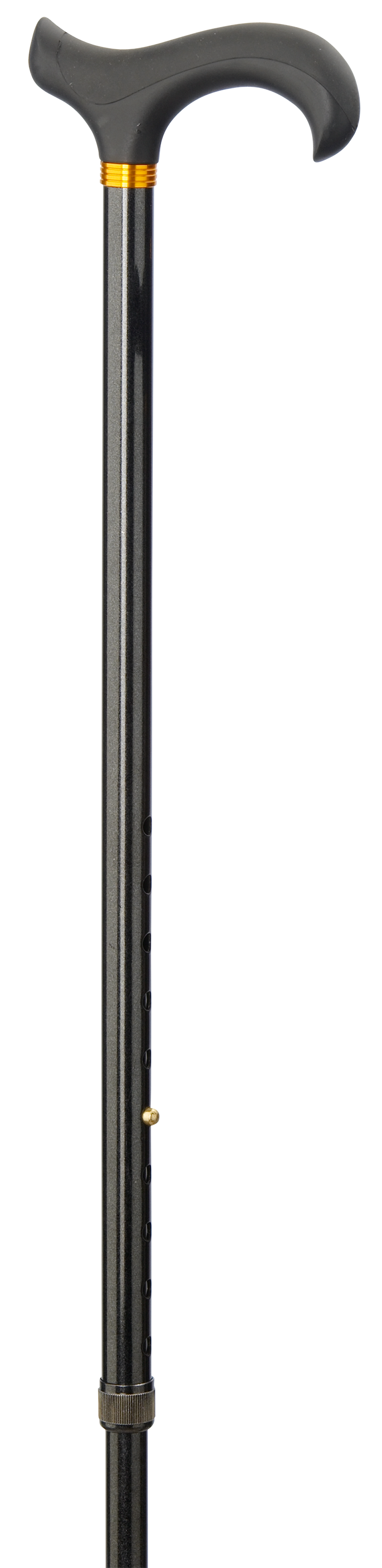 Extra stabiele steunstok van roestvrij staal met superzachte DERBY-handgreep van kunststof met handgreep van zacht rubber. In hoogte verstelbare steel met een glanzende afwerking. Met messing ring en rubberen stootrand.