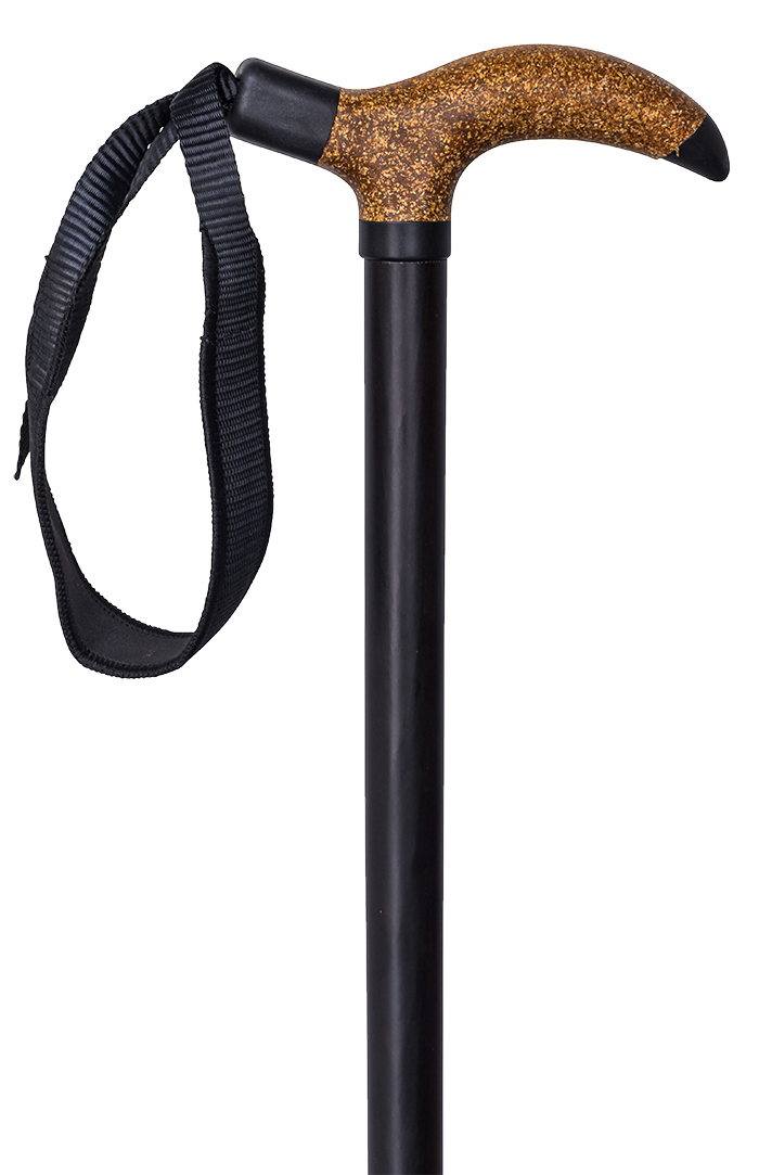 Handgemaakte wandelstok met elegant gebogen SMART handgreep gemaakt van imitatiekurk in middenbruin, met zwarte pols lus, en slanke steel van beukenhout, gebeitst in zwart en gelakt met een satijnen afwerking.