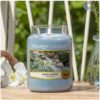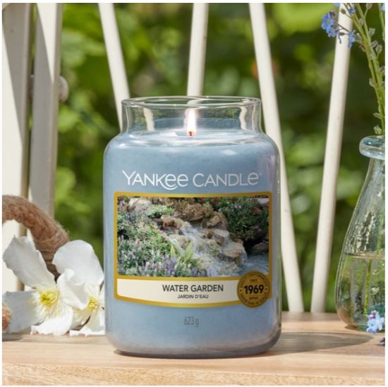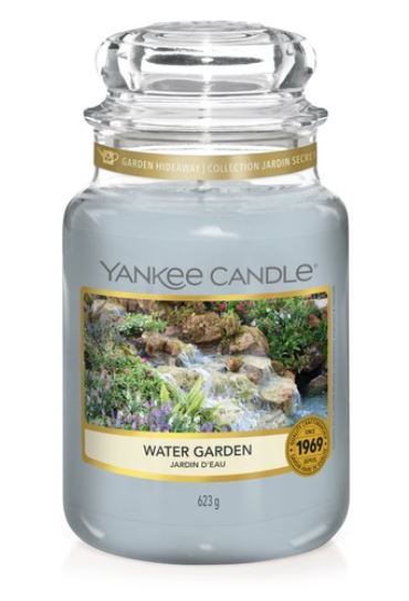 Yankee Candle Water Garden geurkaars in een grote glazen pot. Deze geur neemt je mee naar een idyllische oase in de achtertuin waar witte bloemen in volle bloei een zoete geur toevoegen aan de rustgevende geluiden van koel, stromend water uit een kabbelend beekje.