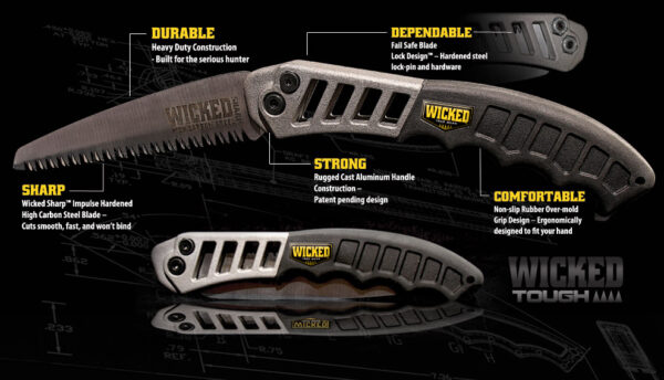 The Wicked Tough Hand Saw has been our goal for going on 10 years now. If you are tired of breaking multiple cheap plastic hand saws each season; the Wicked Tough Saw is the product that serious hunters and outdoors people have been waiting for. The patent pending cast aluminum handle design is the foundation for the strongest handle and blade locking mechanism that has ever been produced. The Wicked Sharp blade is strong, won’t bend or break, and rips through any tree or limb you put it to. The rubber over molded grip fits your hand like a glove, and positions your arm for the easiest and most efficient cutting you have ever felt. Before you break your next cheap plastic saw, get a Wicked Tough Saw; the last folding hand saw you will ever buy!