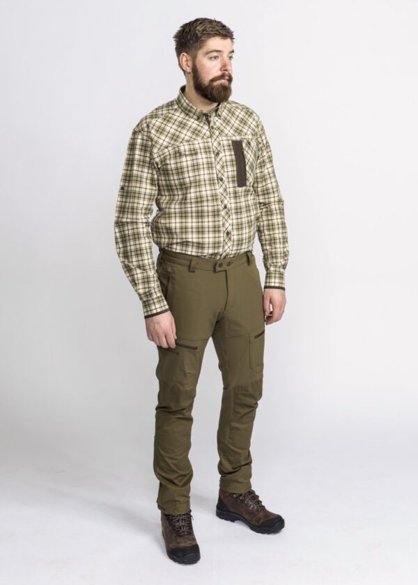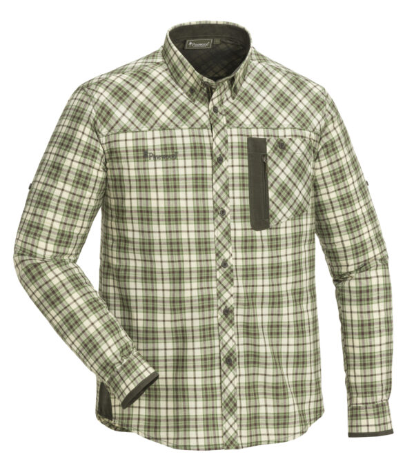 Pinewood Wolf shirt met insectenwerende finish. Uitgerust met een borstzak met knoop en een extra zak met rits. Knoopkraag. Stijlvolle details in jacquard. Met bandje om opgerolde mouwen vast te zetten.