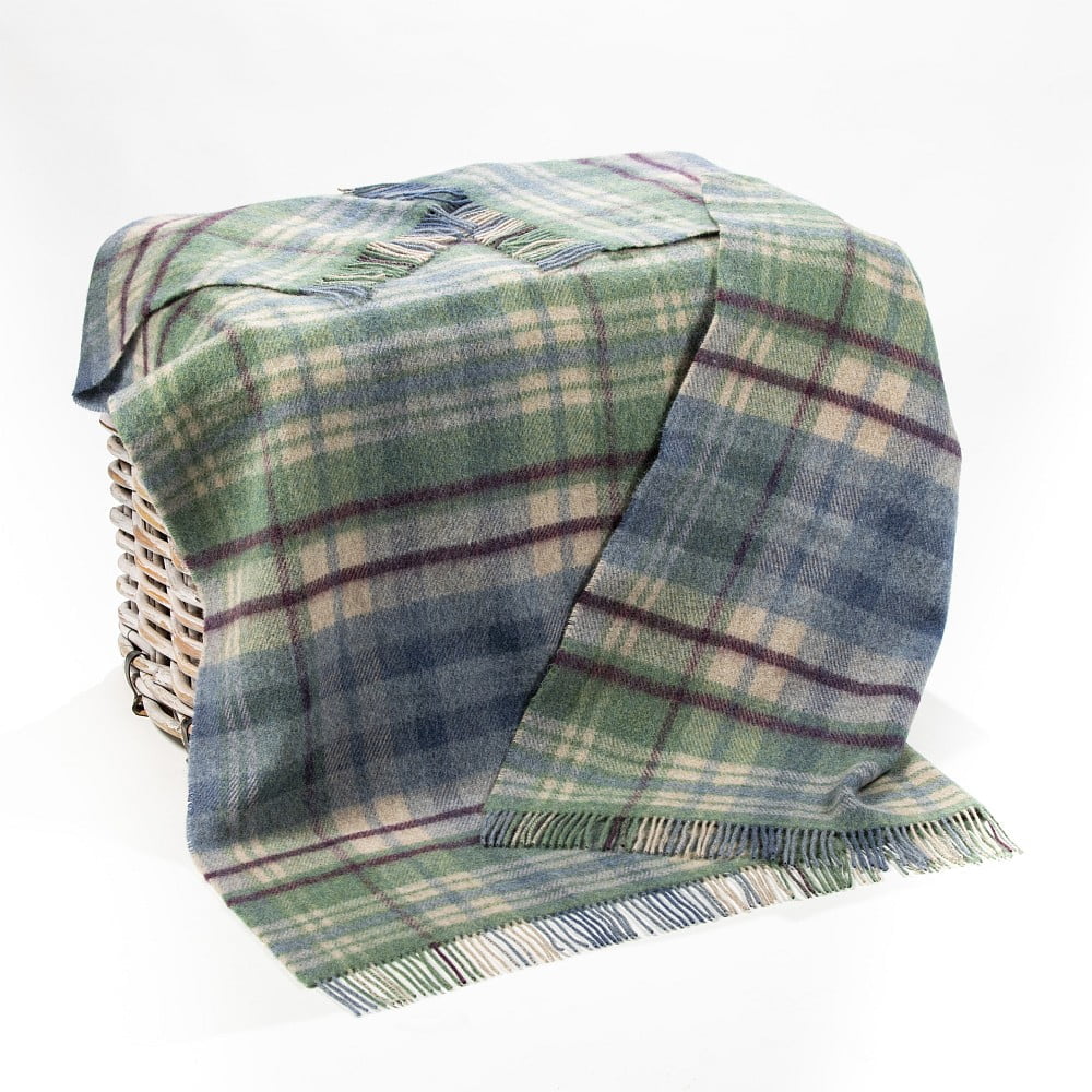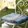 Grote Ierse plaid in een denim-groen-camel-bordeaux ruit. Breng warmte en erfgoed naar je buitenavonturen met deze robuuste en duurzame plaid. In Tipperary geweven van 100% pure Shetlandwol.