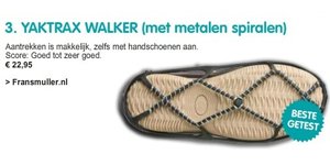 Tijdens een normale winter glijden er meer dan 18 duizend mensen de Eerste Hulp binnen. Om glijpartijen te voorkomen, heeft de ANWB 9 sneeuwkettingen voor onder de schoenen getest. De Yaktrax Walker is als beste getest met als score goed/zeer goed. Gemakkelijk aan en uit te trekken, zelfs met handschoenen en de beste grip. Ook de Wintertrax komt goed uit de test.