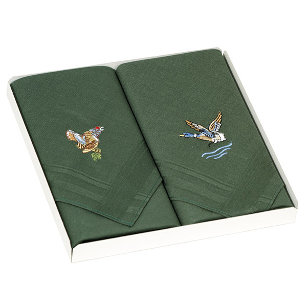 Twee fraaie zakdoeken, geborduurd met jachtmotieven. In kadoverpakking.