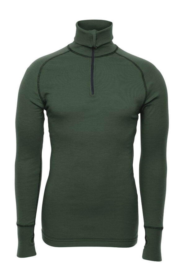 Brynje Arctic Extreme Double Norgie Shirt, Superwarm ondershirt met een rits waardoor je van de kraag een col kunt maken. Extra lange mouwen met een duimgat, waardoor polsen en handen tot aan de vingers, warm blijven. Het materiaal is dubbel: meraklon mesh aan de binnenkant dat geen vocht opneemt zodat je bij transpiratie geen nat hemd aan je rug krijgt, en een buitenkant van merino wol. Dit ondershirt is buitengewoon goed geschikt voor echte koude, anders is het gauw te warm. Kleur: groen.